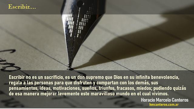 "Escribir no es un sacrificio, es un don supremo que Dios en su infinita benevolencia, regala a las personas para que disfruten y compartan con los demás, sus pensamientos, ideas, motivaciones, sueños, triunfos, fracasos, miedos; pudiendo quizás de esa manera mejorar levemente este maravilloso mundo en el cual vivimos..."Horacio Marcelo Canteros ©